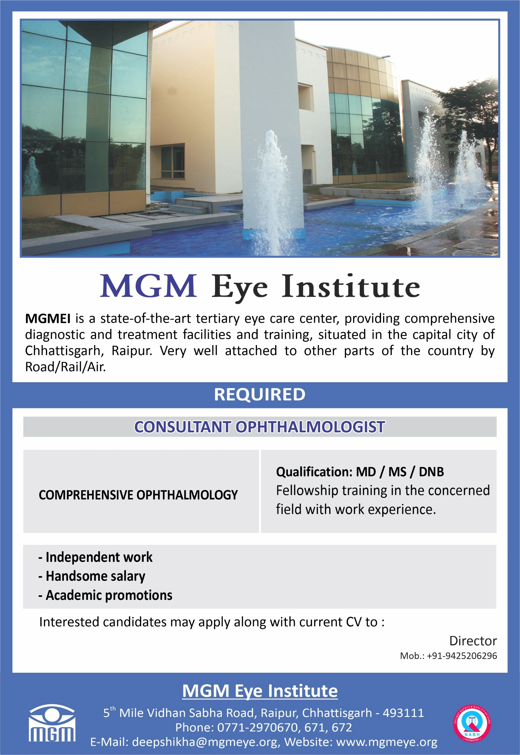 MGM Eye Institute, Raipur, Chhattisgarh, is a premier NABH-accredited eye care institution dedicated to excellence in ophthalmic services, education, and research. With over 800,000 eye examinations and 100,000 successful surgeries, the institute provides advanced diagnostics, medical and surgical treatments across all ophthalmic subspecialties. Committed to community eye health, MGM Eye Institute actively conducts outreach programs, training initiatives, and is expanding its reach through Vision Centers. With a patient-centric approach and state-of-the-art facilities, the institute upholds the highest standards of ethical and quality eye care, ensuring accessibility and affordability for all sections of society.